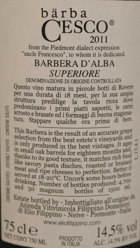 Barbera Superiore Barba Cesco, Elio Filippino 2011